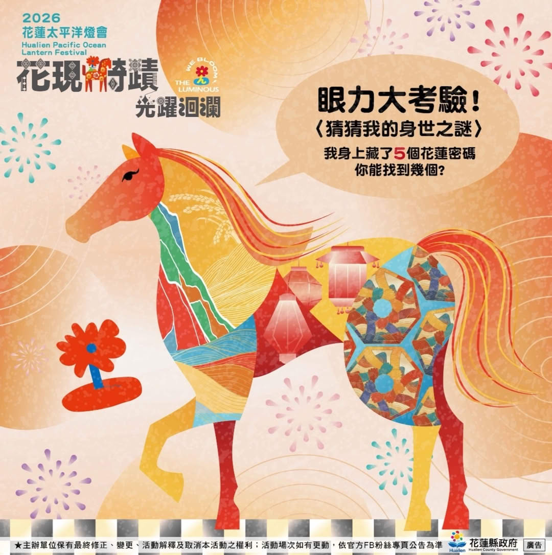 2 猜猜燈會主視覺《馬的身世之謎》 ♞花現騎蹟|光躍洄瀾♞ 眼力大考驗! 猜猜燈會主視覺《馬的身世之謎》( 文末有禮)號外速報日出大道上,出現一匹眼神堅定向前的馬 住海邊小編 悄悄透露——這匹馬身上藏了個花蓮密碼,你能找到幾個? 胸前的線條,像一座熟悉的山(________) 前腳踩著的,是不斷湧動的海(________) 頸項上的紋路,是風吹過農作(________) 身體,是家家戶戶亮起的(____) 後腿,是民族牽起共融的力量 環繞牠的迴圈,正是洄瀾流動不息的軌跡❃ 這不是一匹普通的馬 ❃牠乘載著整個花蓮,正踏著日出大道的曙光,奔躍在 留言告訴我們馬的身世謎底(空格全填即可!) 2/7 開幕當日,抽出 8 名 幸運朋友 送出 燈會限定小禮 2026花蓮太平洋燈會 ♞花現騎蹟 光躍洄瀾♞活動地點:花蓮市日出大道(重慶市場、東大門夜市旁) 活動日期: 2026.02.07(六) – 03.08(日)每晚18:00~22:00 (2月16日除夕休息 )還沒追蹤?快鎖定我們花蓮觀光粉絲團https://reurl.cc/dqv7E6IG 追蹤 https://reurl.cc/aM71oDThreads 追蹤 https://reurl.cc/EbaGEa花蓮旅遊小助理 https://hualien.travel/ai-service/主辦單位保有活動最終解釋權#花蓮 #2026花蓮燈會 #花現騎蹟光躍洄瀾 #主視覺解密 #大家來找碴 #猜謎 #抽獎文 2026花蓮太平洋燈會TheLuminousWeBloom光之藝術節花現騎蹟光躍洄瀾花蓮山海之光花蓮旅遊